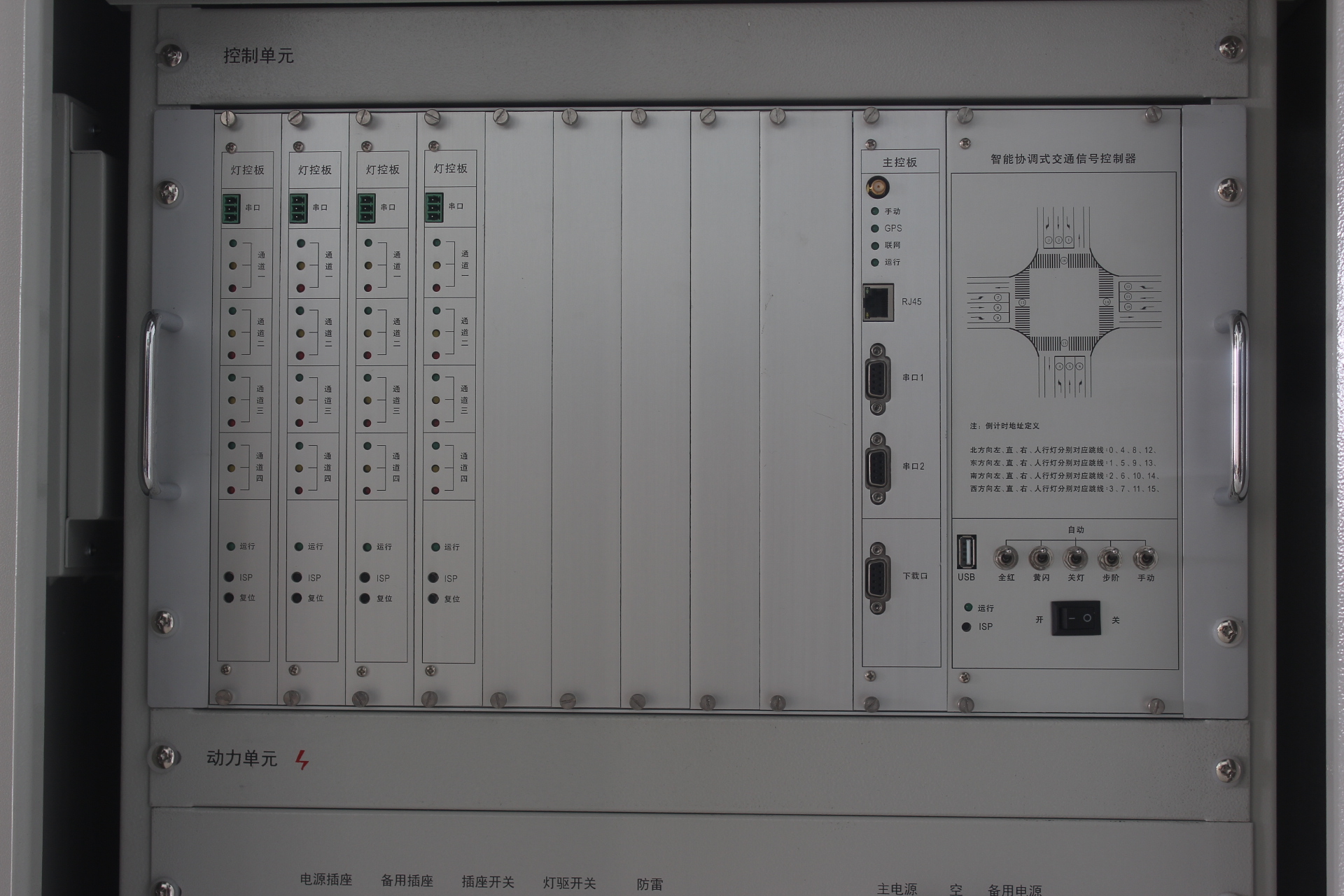 | 6、最大可配置燈驅(qū)控制模塊板8塊,支持96路燈驅(qū)輸出,支持32個(gè)主相位,實(shí)現(xiàn)雙路口的集中16相位控制; |